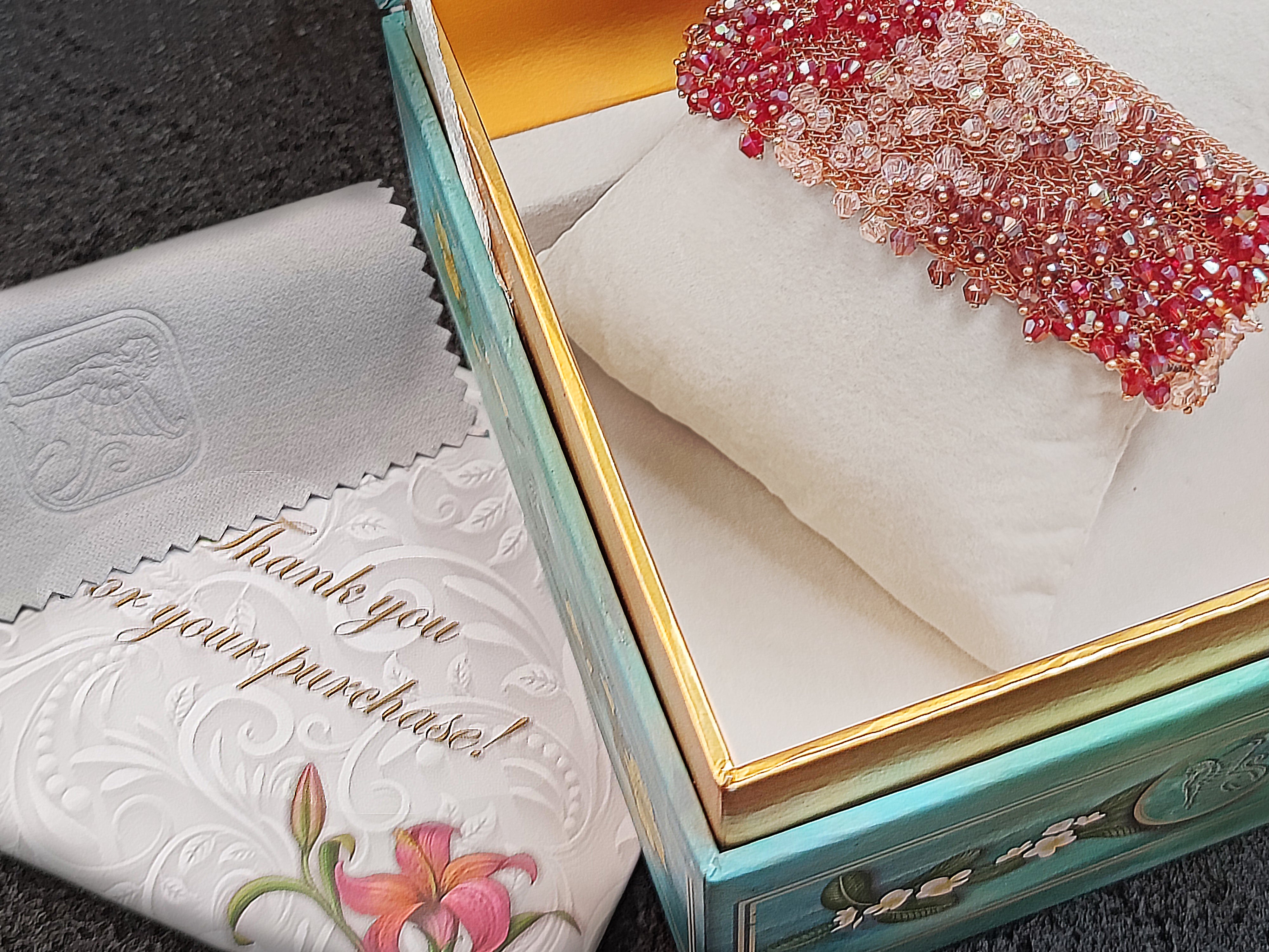 The extravagant packaging of our luxe items is further completed by soft velvet inserts and a dedicated microfiber cleaning cloth to keep your jewelry lustrous.