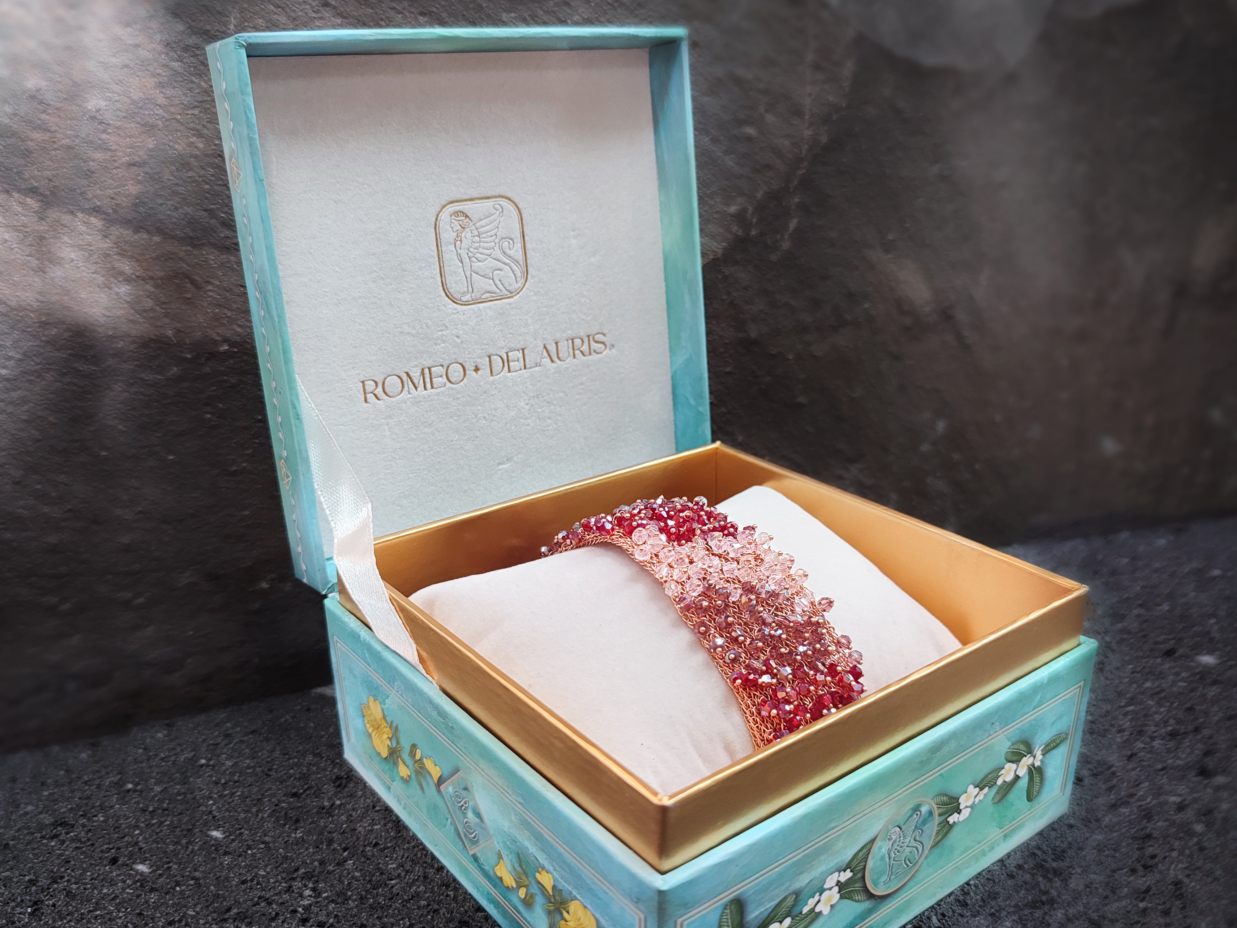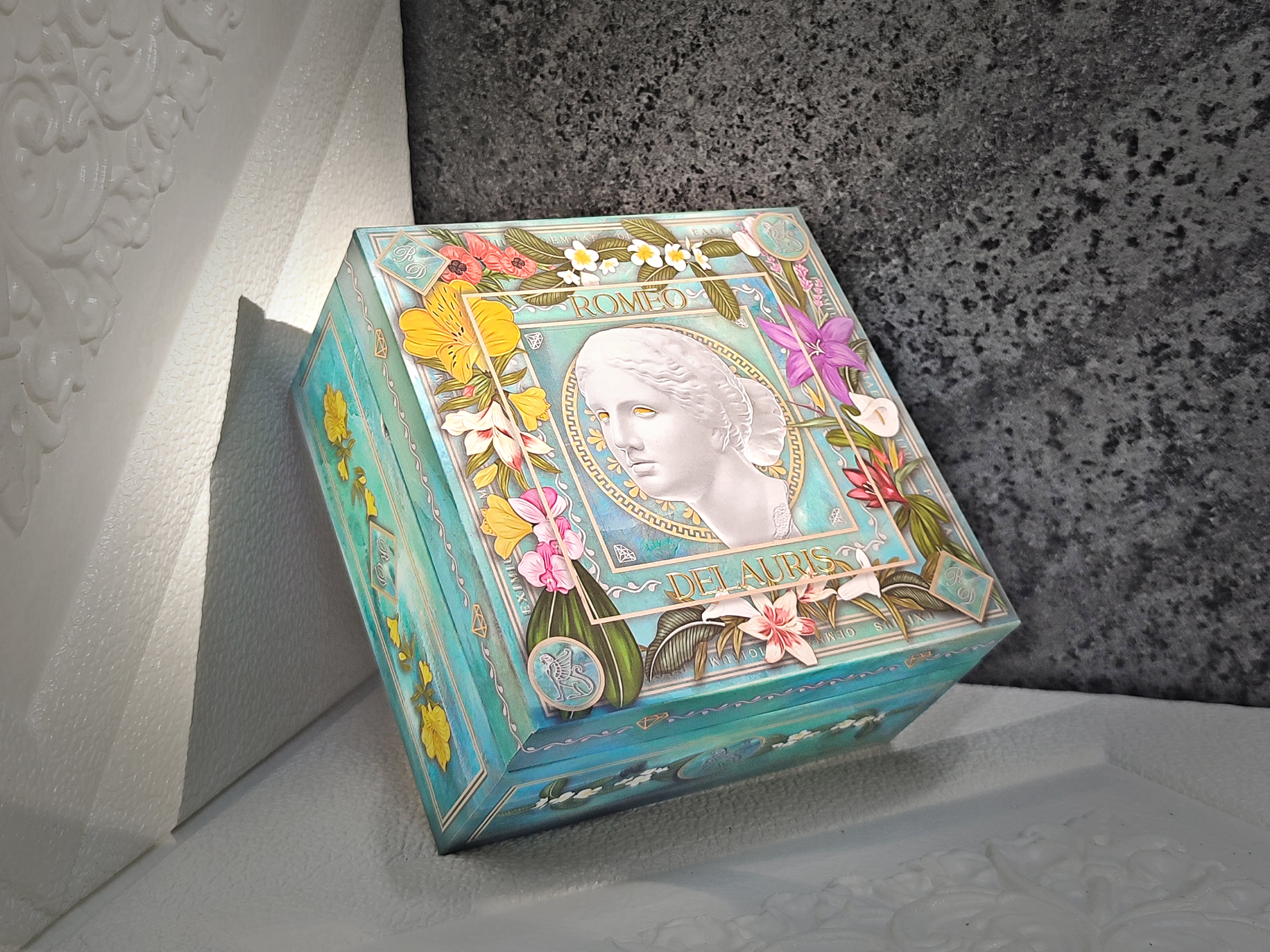 Illustrated with a floral pattern inspired by the Balinese nature and a variety of Greek, Italian and Latin elements, this complementary box highlights the elegant aesthetics and influences of Romeo Delauris.